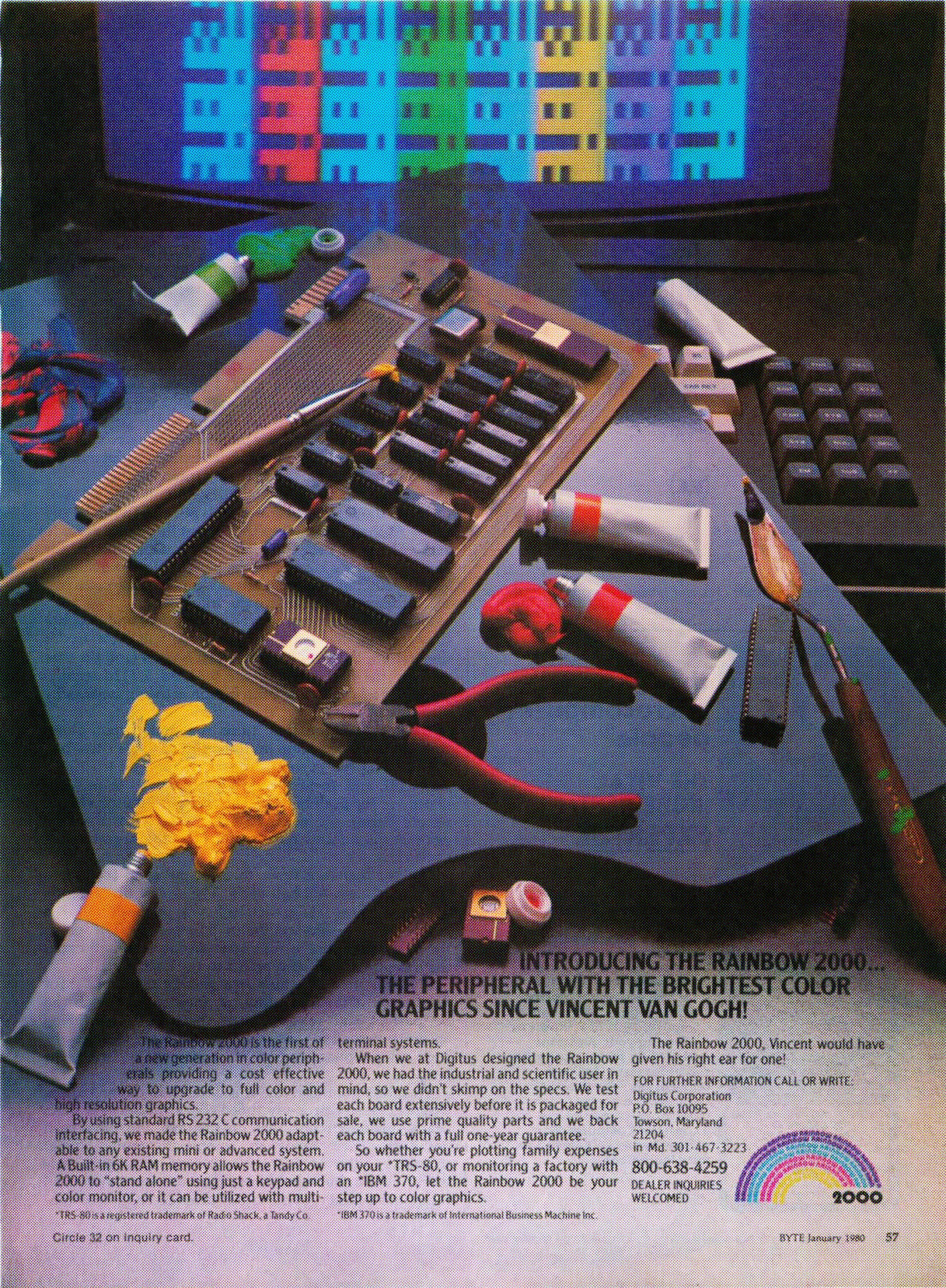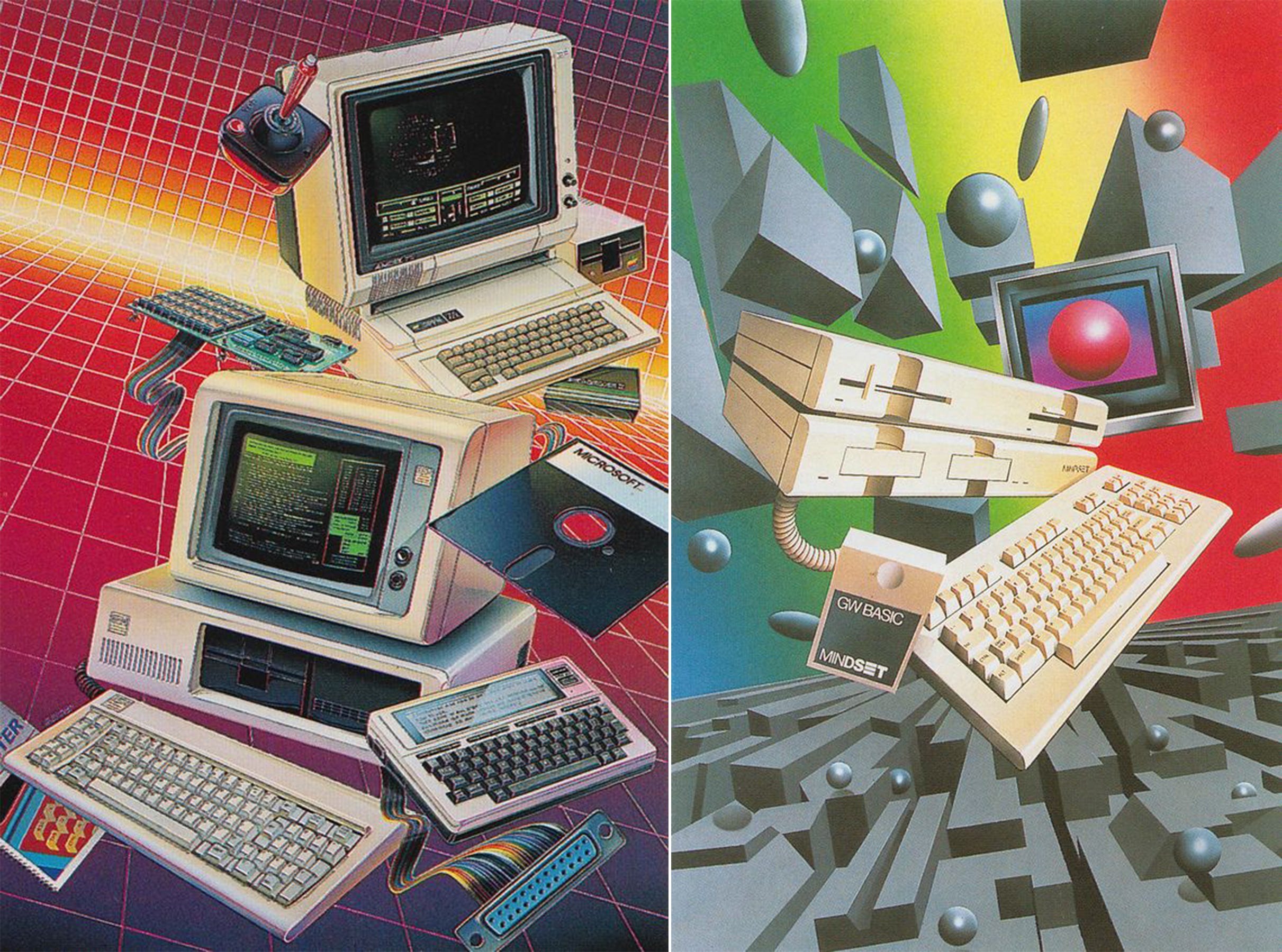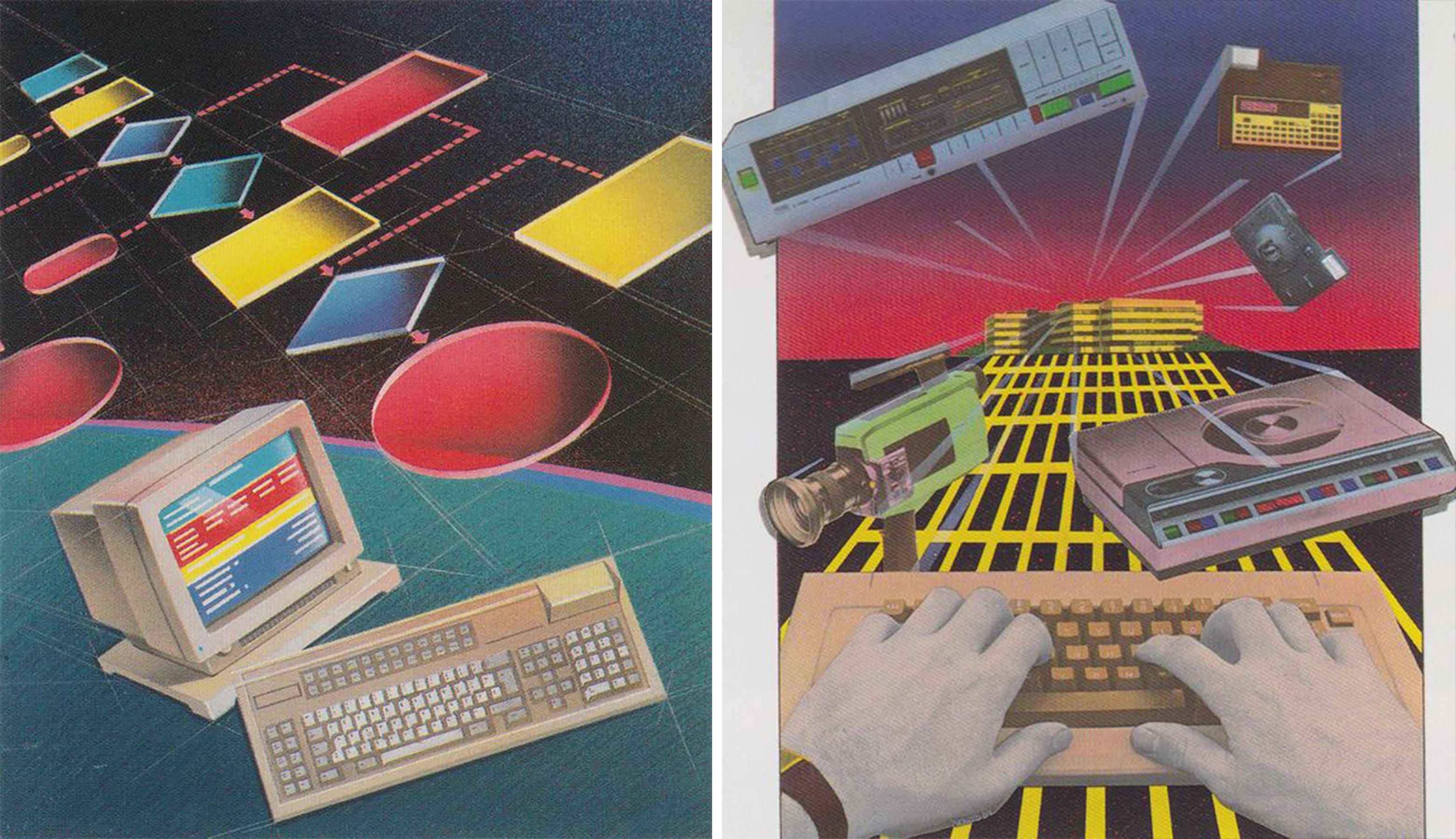 Digging through magazines like Byte, 8000 Plus Magazine, and Compute, each page feels fresh, experimental, different. The language used to describe computers is always decorated with “portable”, “personal”, “versatile”, and “new” alongside flashy technicolor patterns, arranged still life photography, stylized airbrush graphics and sci-fi backdrops to remind you that the future is here. Some favorites below: