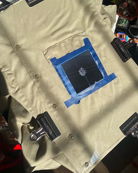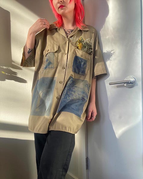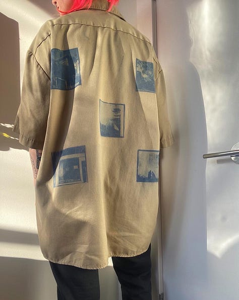 I actually started this in January, but I got back into Cyanotype/Solar printing, this time on garments. Alternative photo processes was something I experimented with in college, I took a class about creating Cyanotypes and Van Dyke Brown prints and even created several art books I still have now. This time I was going to try printing on a button up using film photos my partner & I took when we visited the PNW/San Francisco last year.