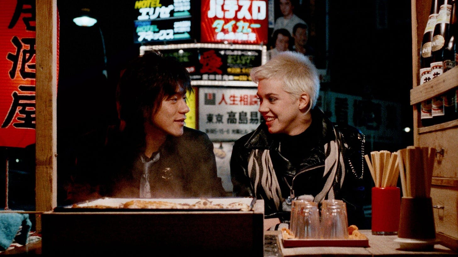 Wendy, an aspiring singer living in NYC, moves to Tokyo with dreams of making it big in the music industry. There she meets Hiro, a rock & roll musician who convinces her to be the lead singer of his band. Imagine you’re flipping through the bargain bin of 80s synth pop 45s at a record store, becoming enamored by the colorful artwork, photographs of women in maximal kitschy clothing and accessories. Maybe they’re covering a famous song you love. This feels like one of those album covers coming to life, highlighting a story of musicians who had a small career moment but didn’t become the next Duran Duran. Also, 80s Tokyo looks so vibrant and colorful here!