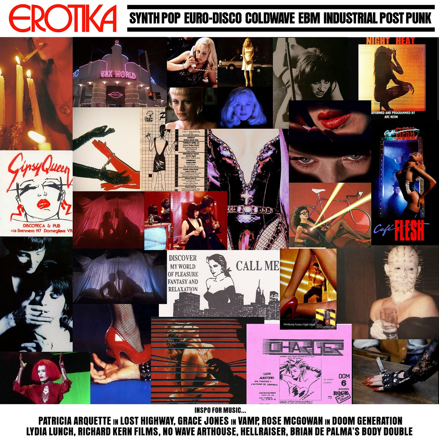 The design itself was printed and then scanned to get that nice authentic paper texture. I’ve let go of my signature color for this one because I wanted to remain authentic to the era of the flyer—making it a black & white design, printed in batches on color paper. The image on the top left of the page is from a 1982 movie called Café Flesh, which I won’t cover in this newsletter because it’s an Adult Film (but it is worth watching if you like amateur arthouse, dystopian sci-fi B-movies). The Memphis Milano set pieces and overall New Wave Erotica themes felt like an inspiring fit for the poster imagery. Stephen Sayadian also directed another film I’ve talked about in this newsletter called Dr. Caligari, which I very much loved and feels like a companion to this adult film he made.