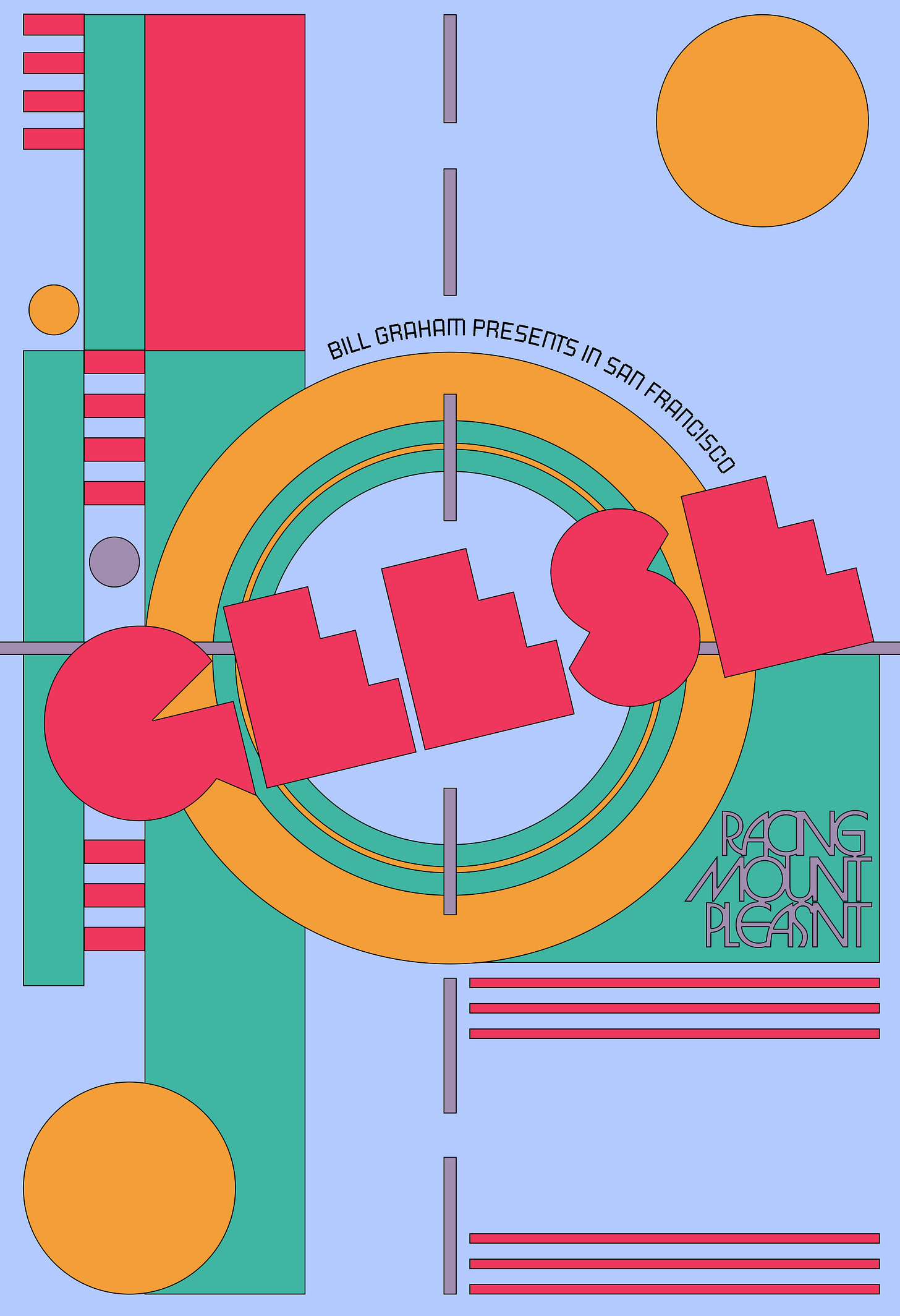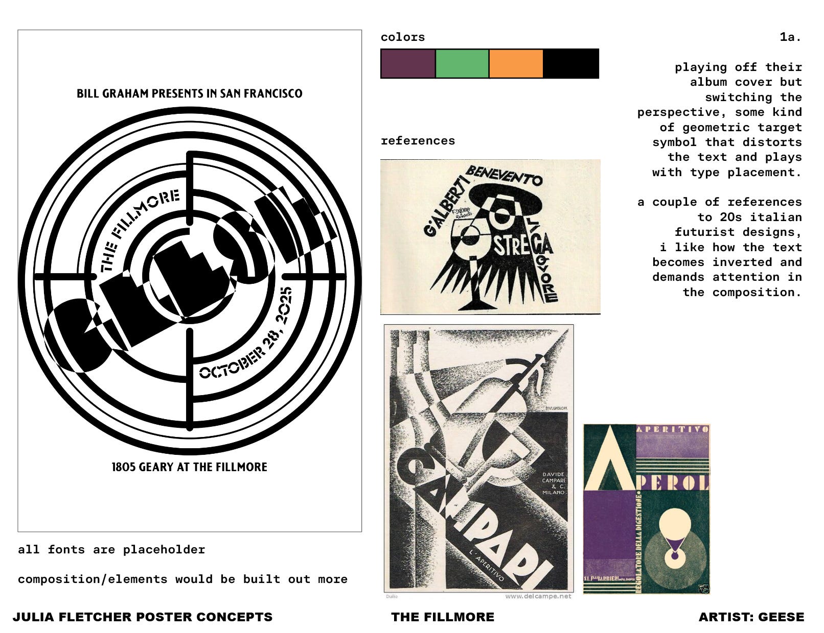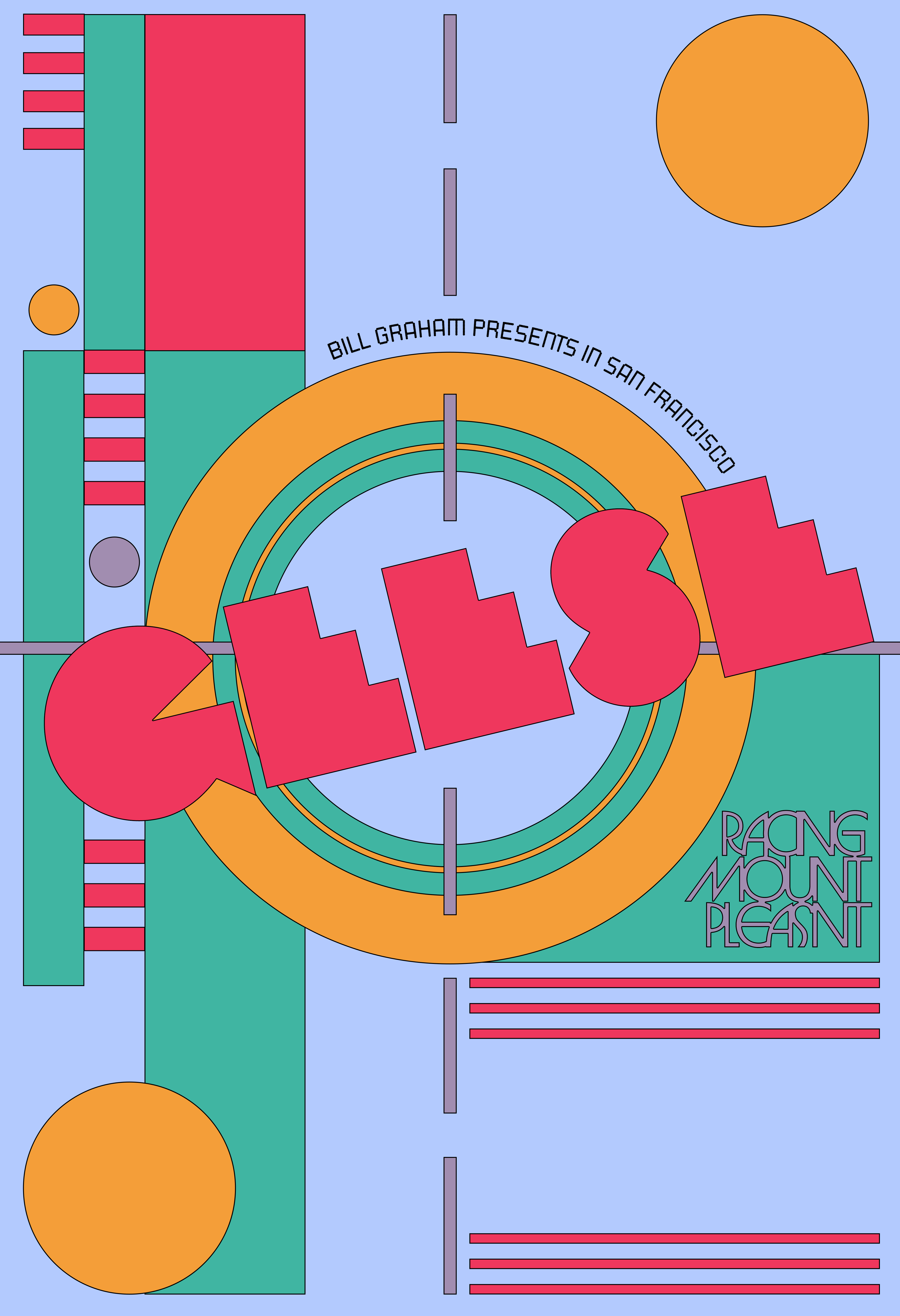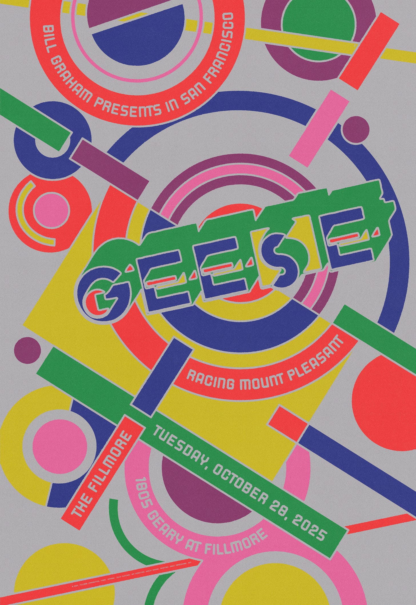 The Fillmore reached out to me and asked me to submit a few concepts for Geese, a band I’ll admit I don’t know a ton about but I know their fans are dedicated and their art direction for their new album, Getting Killed, rocks. I sent over a couple of sketches, and the one we settled on was a killshot target poster, mirroring the cover that presents a gun pointed at the camera. Additional inspiration for the poster was Fortunato Depero, geometric Italian typefaces, early illustrated covers for Vanity Fair, and Robert Indiana’s American Dream portfolio. The original color palette I pitched as being pretty restrictive, but as you can see it ended up being very colorful (for the best).