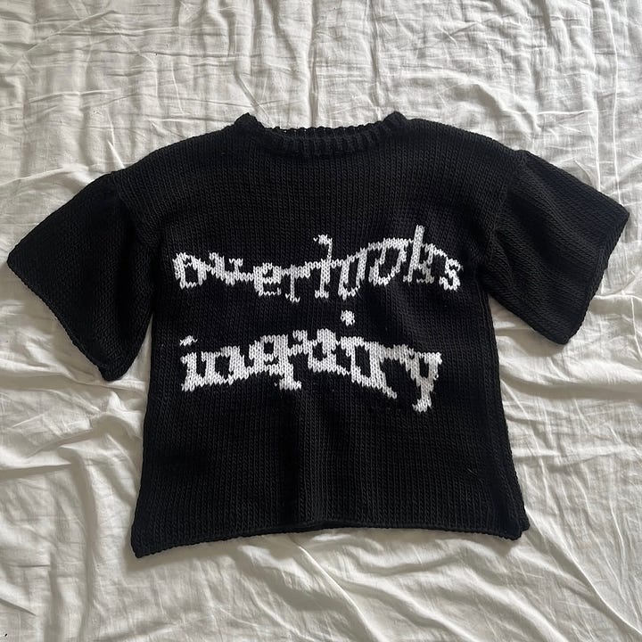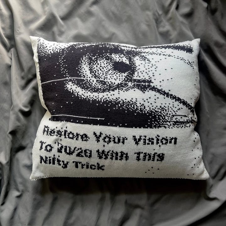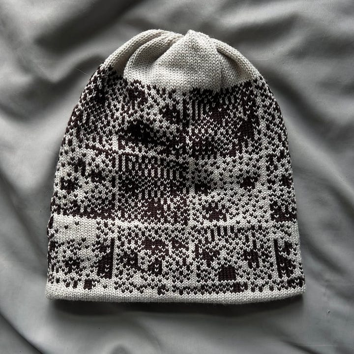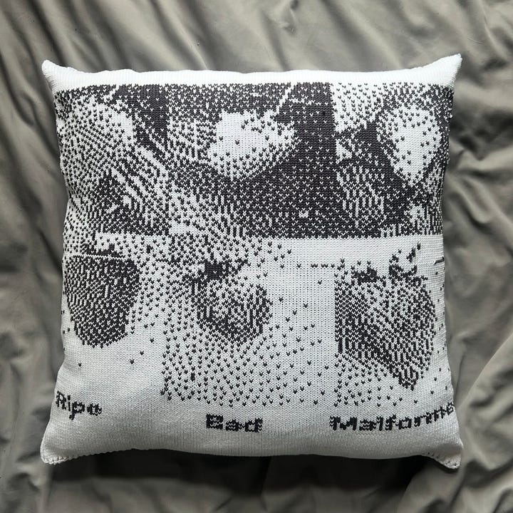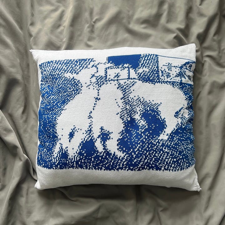 I’ve been following the project Dazy Chains by Hayley Mortin, a UX researcher and artist in Montreal whose work explores the intersection of fiber arts and AI systems, and the interwoven history of computers and textiles. Seeing the generative and analytical digital reference image go through both a machine and hand knit technique completely reframes and softens it. I love the outcome of taking computer images and incorporating them into art pieces, her artworks and research are super interesting and I highly recommend checking out the rest of her portfolio!
